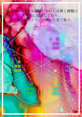 次ぎに、エスプリ画の基本形を描き、それぞれのキーワードをエスプリ画の6領域に振り分けます。そして、各領域ごとに、集められたキーワードを手掛かりに目標と課題を定めて、将来のシナリオを明確にします。【第2巻、第3巻】